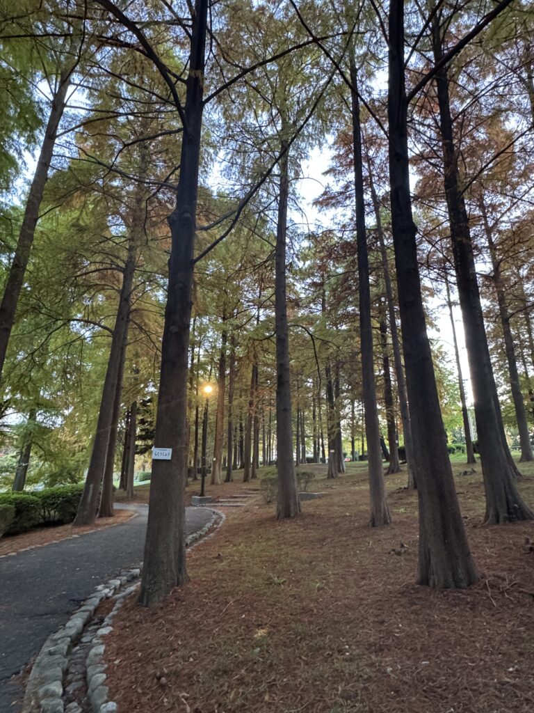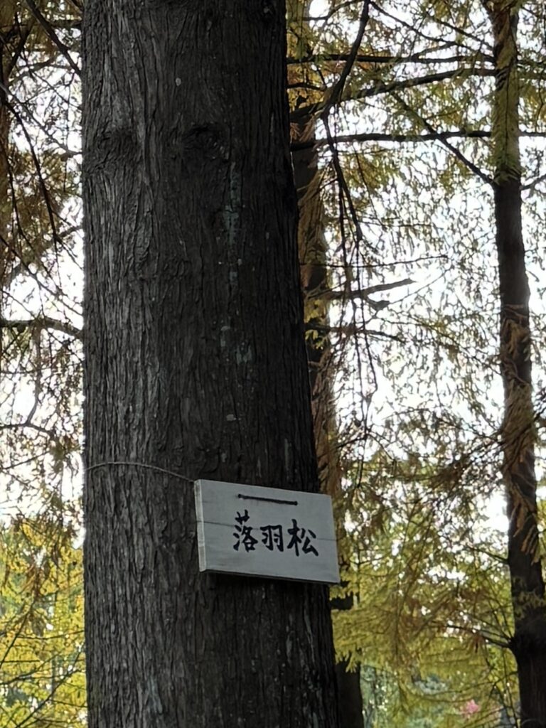 ”秋になると羽のような葉が紅葉して落ちることから「落羽松」という美しい名前がついています。”とのこと。なるほど。