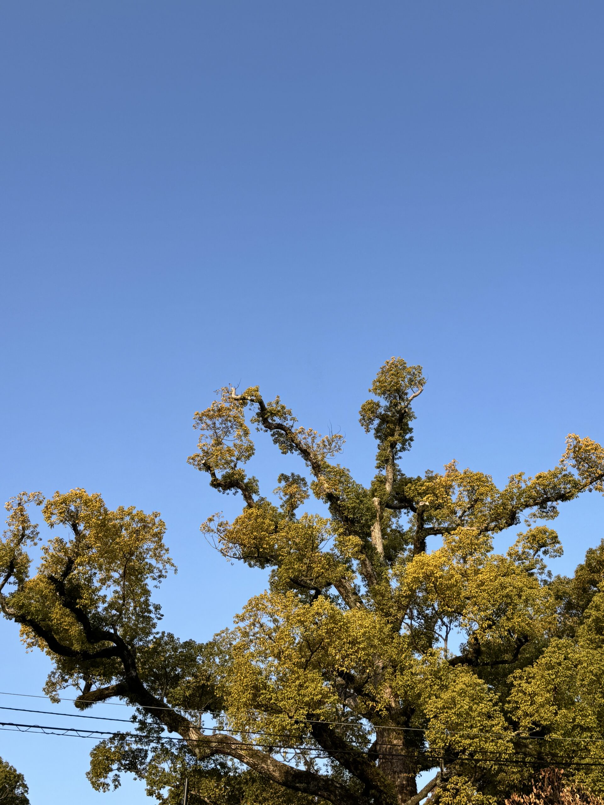 朝イチで氏神様へ。これは鳥居をくぐる前に撮ったご神木 大空にすくっと伸びている姿に元気をもらって。